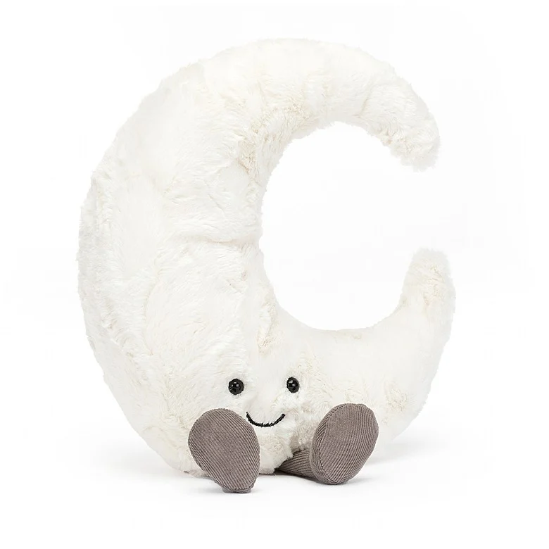 Prachtig gestructureerd met fluweelachtige kraters, Amuseable Moon zit vol plezier! Deze parelwitte vriend is een rondingen en knuffelig maatje voor het slapengaan. Met squidgy cord-slofjes, een verzwaarde billen en een vredige glimlach, is deze wassende maan poëtisch! Een magische halve maan en een prachtig cadeau.